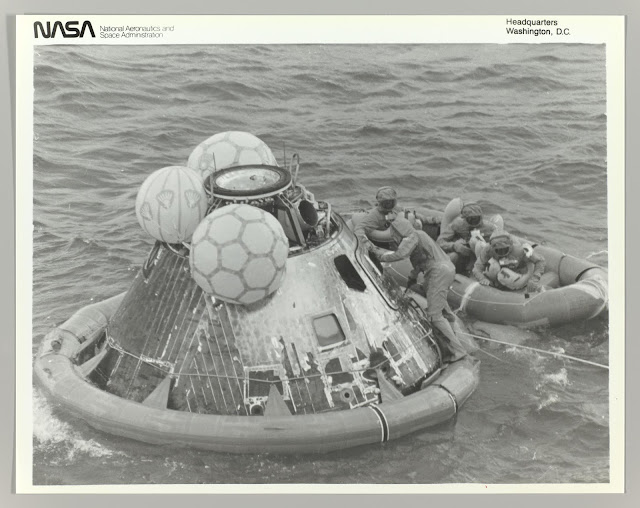 Astronautii de pe Apollo 11 ,in barca de salvare ,dupa amerizarea de la intoarcerea pe Pamant.
